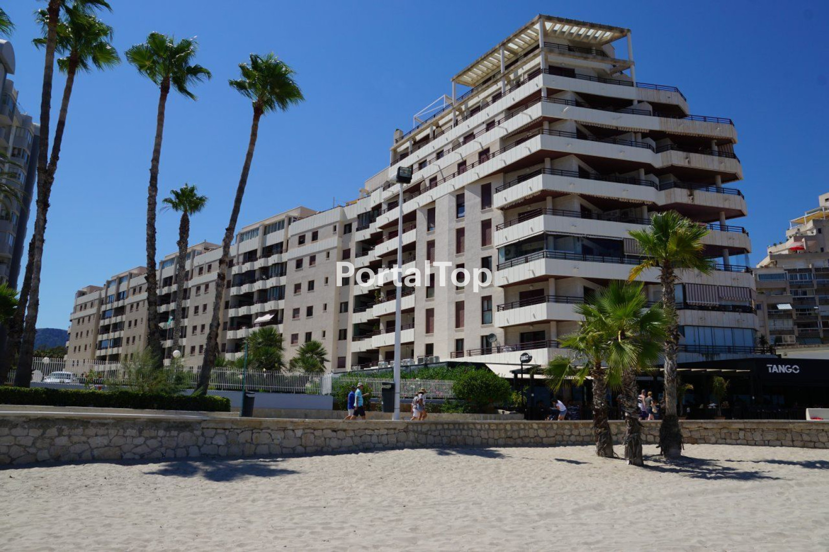 - A 3rd floor first beach line apartment on Calpe's Playa de la Fosa. Comprising of 2 double bedrooms with fitted wardrobes and air conditioning, 2 bathrooms (one en-suite), an independent fitted kitchen, and a living-dining room opening to a covered terrace with sea views. Also a second east facing terrace. Double glazing, hot/cold air conditioning. Three community swimming pools, recreation area and a direct entrance the beach promenade. Consierge. Sold furnished. Apartment 90m2[IW]