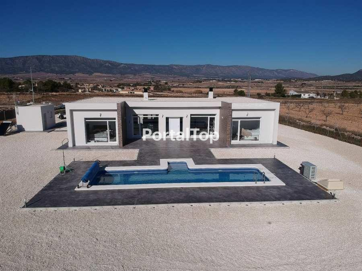 NEW BUILD VILLAS IN PINOSO You can choose Villas with traditional Spanish touches or super modern finishing, bright and clean. Different legal building plots available (rustic with minimum 10.000 m2), some walking distance to town, some totally private and our most popular ones are within 5-10 mins drive to a town. We have a plot for every taste, all with amazing views and all have mains water + electric included in the price and high speed internet available. From the biggest and best builder in the area and use top quality materials for a perfect finish. All houses include 2m stamped concrete terrace around the pool (colour and pattern to choose), 1m around the house, gated entrance, 3.000 m2 fencing, pre-installed ducted aircon, standard kitchen, security door, german tilt and turn windows (or sliding if prefered), built-in fireplace and chimney, pre-installation for tv and internet, gravel driveway plus a few meters around the house, septic tank. Bathrooms include a shower column, shower tray or bath, sink units (various colours to choose from) with sinks, taps and mirrors, plus a big selection of wall tiles. Wide selection of ceramic floor tiles, different colours, wood effect, etc. Kitchens include cabinets with standard doors and handles, as per plans provided, stainless steel sink and tap, pre-installation for oven, dishwasher, extractor. Various granite worktops to choose from included in the budget, other stone worktops available as extras. White goods not included. Marble staircase (cream, white, or grey) and railings included, plus railings for the front porch. Big fixed glass window on the staircase for extra light. Choice of tiles and steps design for swimming pool. Choice of the granite for the houses' exterior steps and window sils. You can customise the house to suit, most internal changes are free of charge, the houses can be extended and we can even build your own design. Upgrade to bigger pool, single or double garage, guest house, etc. at an extra cost. The beautiful and thriving town of Pinoso is approximately 45 minutes inland from Alicante and the white beaches of Costa Blanca and close to the Murcia, Alicante border It has a population of just under 8,000. Pinoso, also known as El Pinos is named after the pine trees that cover the areas mountain ranges. Pinoso provides a Spanish rural lifestyle, no traffic lights, hardly any traffic, practically the only jams are caused by the tractors taking the grapes to the Bodega. The fields are planted with vines, almonds and olives. In February the fields are filled with pink almond blossom. Pinoso has many bars, restaurants and shops, a new 24 hour medical centre, dentists, two primary schools and 1 secondary school, a theatre. There's an excellent Sports Centre with outdoor swimming pools, tennis courts, football pitches and gymnasium, library and many other facilities including a beautiful picnic area among the pines, complete with barbecues, seating areas and running water.