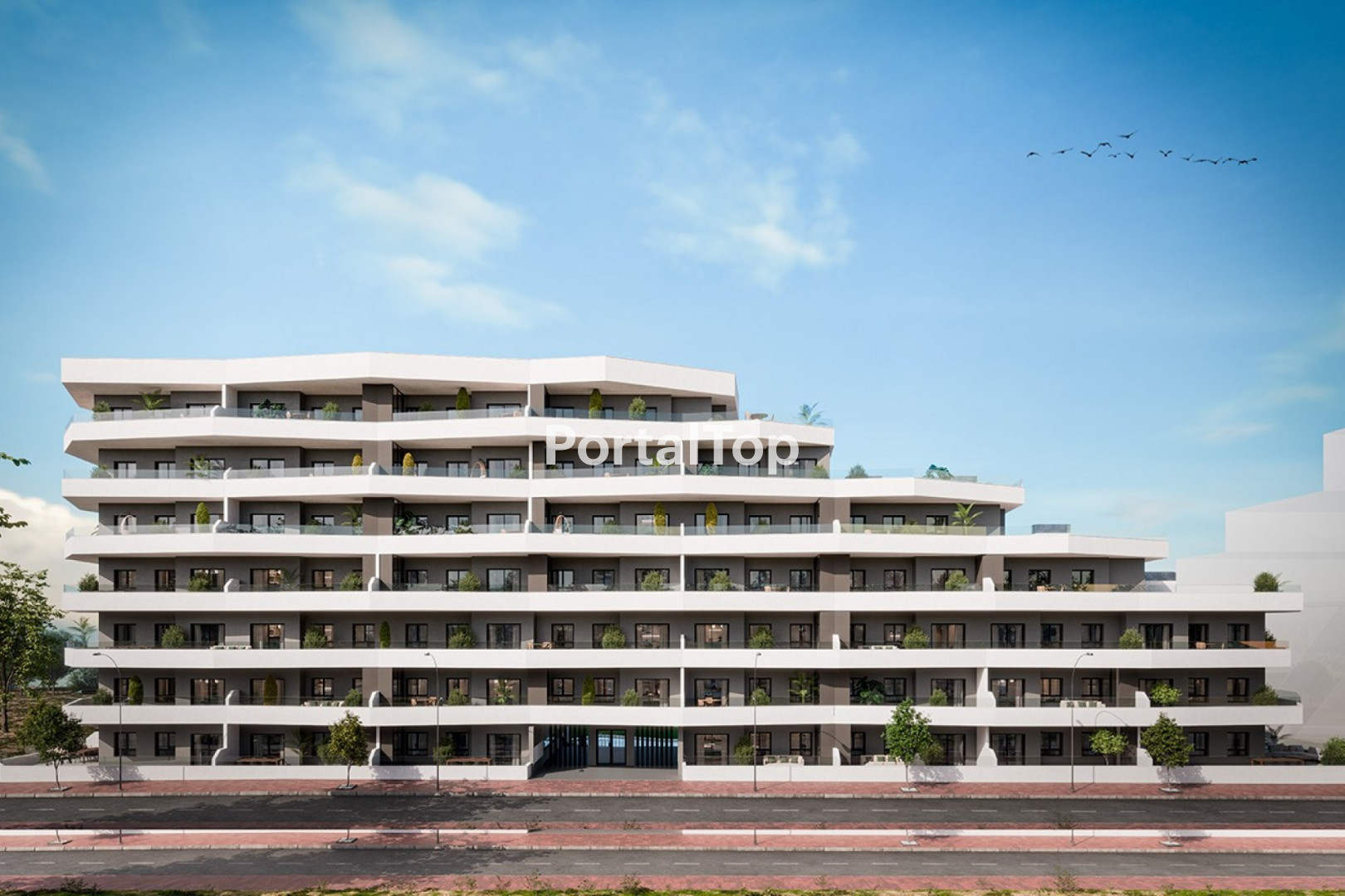 Costa Blanca Eiendom presenta un nuevo proyecto residencial en San Miguel de Salinas, un enclave que combina tranquilidad y proximidad a los principales servicios. Este exclusivo complejo consta de 165 modernos apartamentos distribuidos en 7 plantas, con opciones de 2 o 3 dormitorios y 2 baños. De estas viviendas, 30 son áticos que ofrecen vistas privilegiadas y amplias terrazas. Las viviendas están diseñadas para maximizar la luz natural y la comodidad. Los salones cuentan con grandes ventanales correderos que se abren a soleadas terrazas, desde donde se pueden admirar las vistas a las montañas o al centro de San Miguel de Salinas. Las cocinas abiertas, completamente equipadas con electrodomésticos modernos, forman el corazón de cada vivienda. Los amplios dormitorios principales incluyen armarios empotrados y baño en suite. El complejo está ubicado en una urbanización cerrada que proporciona seguridad y tranquilidad. Los residentes disfrutarán de jardines comunitarios bellamente diseñados, una gran piscina, piscina infantil y una zona de juegos, ideales para el ocio y el relax. Además, cuenta con aparcamiento subterráneo y ascensores que conectan todas las plantas, ofreciendo una experiencia de vida moderna y funcional. Este proyecto destaca por ofrecer opciones para todos los estilos de vida, con viviendas disponibles en planta baja, entrepiso y planta alta. Las viviendas de la planta baja incluyen jardín privado, mientras que las superiores disfrutan de terrazas y áticos con vistas inigualables. La ubicación estratégica del complejo proporciona un entorno tranquilo con vistas a las montañas, pero también acceso cercano a tiendas, bares, restaurantes y otros servicios esenciales. Memoria de calidades: Cimentación y estructura: Zapatas y vigas de hormigón armado. Estructura unidireccional con pilares y vigas planas.Fachada y aislamiento: Doble muro de ladrillo con cámara de aislamiento térmico y acústico. Acabado en mortero monocapa blanco.Carpintería exterior: Ventanas y balconeras de aluminio lacado en gris, con doble acristalamiento y persianas. Barandillas de vidrio de seguridad.Carpintería interior: Puerta de acceso con cerradura de seguridad y puertas de paso lacadas en blanco. Armarios empotrados con altillo.Solados y alicatados: Porcelánico de primera calidad en toda la vivienda. Alicatado de gres en cocina y baños.Instalaciones: Fontanería con materiales homologados, sanitarios de primera calidad, grifería monomando y calentador de aerotermia de 150 litros. Preinstalación de aire acondicionado.Zonas comunes: Piscina principal de 195 m2, piscina infantil, zona de juegos y amplios jardines. Este exclusivo proyecto en San Miguel de Salinas ofrece una oportunidad única para quienes buscan una vivienda moderna, funcional y rodeada de servicios en un entorno privilegiado. Póngase en contacto con nosotros para obtener más información o unirse a uno de nuestros tours sin compromiso para descubrir esta maravillosa residencia.