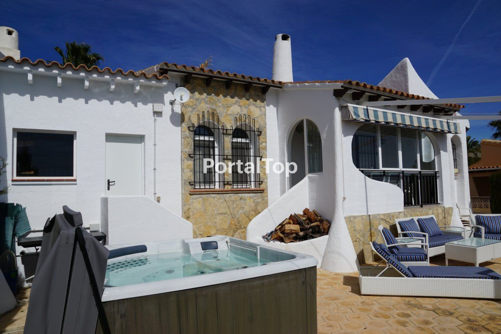 - A beautiful 3 bedroom bungalow in perfect condition. This lovely property includes excellent quality furnishings, new hot/cold air conditioning, new double glazed aluminium windows, sun blinds, SAT TV, internet (fibre now available in the street) and a new bathroom and flooring. The living area comprises of an entrance hall, 3 double bedrooms with fitted wardrobes, a family bathroom, an independent kitchen with an arch and serving bar and a sunny living dining room with a cassette wood burning chimney and French windows opening to a glazed terrace offering beautiful views of the Sierra Bernia. The property includes a closed garage, parking, a rear pation and a sunny south facing terrace offering good privacy (mature cypress hedges) with a family Jacuzzi and barbeque. A quiet locality with a well kept community swimming pool. Bungalow 91m2, plot 163m2.[IW]
