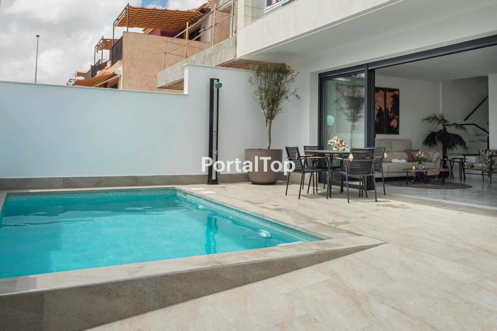 Costa Blanca Eiendom presenta una exclusiva promoción de 4 chalets pareados en San Pedro del Pinatar, ubicados en una zona privilegiada cerca del centro urbano y a pocos minutos de las playas del Mar Menor. Diseñados para ofrecer confort y funcionalidad, estos chalets son ideales tanto para residencia permanente como para inversión. Las viviendas estarán disponibles en marzo y junio de 2025, con precios desde 439.000 euros. Cuentan con materiales de alta calidad, distribución optimizada y amplias zonas exteriores. La planta baja dispone de un luminoso salón-comedor con grandes ventanales que permiten la entrada de luz natural, cocina equipada con electrodomésticos, un dormitorio doble y un baño de visitas. Desde el salón se accede a la terraza con piscina privada de 13 m2, ducha solar y zona de estar, creando un espacio perfecto para el descanso y el entretenimiento. La parcela de 173 m2 incluye un camino privado para aparcamiento. En la primera planta se encuentran dos dormitorios dobles con baño en suite, uno de ellos con balcón privado con vistas a la zona exterior. Además, las viviendas cuentan con calefacción por suelo radiante en los baños, persianas motorizadas y preinstalación de aire acondicionado. Todos los dormitorios disponen de armarios empotrados de gran capacidad. Desde la primera planta, una escalera conduce al solárium privado de 52 m2, ideal para relajarse, tomar el sol y disfrutar del clima mediterráneo durante todo el año. Este espacio es perfecto para reuniones con familiares y amigos, ofreciendo una gran privacidad y comodidad. El jardín combina gres, grava blanca y césped artificial, proporcionando un entorno elegante y de fácil mantenimiento. San Pedro del Pinatar es una localidad que destaca por su excelente calidad de vida y sus servicios, incluyendo supermercados, restaurantes, colegios y centros de salud. Su estratégica ubicación permite acceder en solo 5 minutos al centro comercial Dos Mares y en 35 minutos al aeropuerto de Murcia (RMU), mientras que el aeropuerto de Alicante (ALC) se encuentra a 45 minutos en coche. Además, su proximidad a las playas del Mediterráneo y el Mar Menor, así como a parques naturales protegidos y diversas opciones deportivas y de ocio, la convierten en una opción ideal para quienes buscan un equilibrio entre tranquilidad y accesibilidad. Póngase en contacto con nosotros para obtener más información o únase a uno de nuestros tours sin compromiso para descubrir este magnífico proyecto.