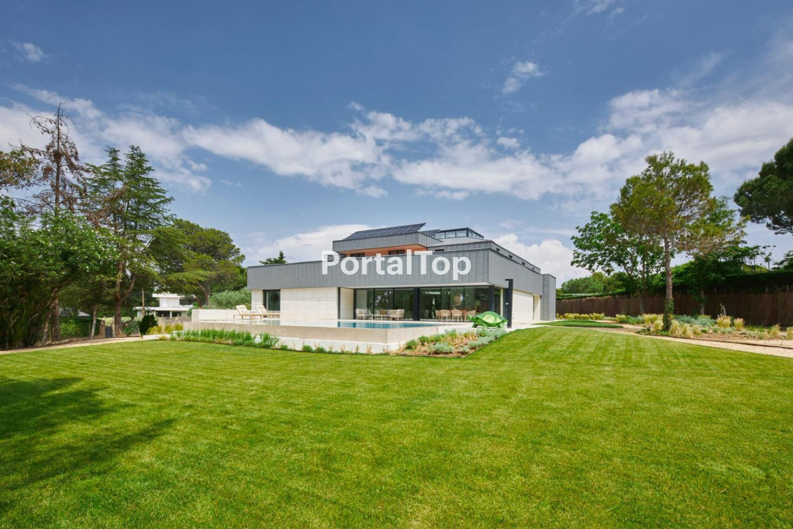 VILLA BÁRBARA Ubicada en la exclusiva urbanización Monte Alina, en Pozuelo de Alarcón con acceso controlado mediante identificación por DNI y autorización telefónica del propietario. Cuenta con vigilancia 24 horas mediante empresa de seguridad privada. La parcela de 2.320 m2 con 495 m2 construidos, está distribuida en dos plantas sobre rasante. ESTRUCTURA Área principal: desde donde se accede al interior a través de una gran puerta de madera pivotante y se llega a un hall muy luminoso todo de cristal fijo, con un armario gabanero y aseo de cortesía. . Área de servicio: destinada a las tareas domésticas y el personal de apoyo. Cuenta con dormitorio de servicio, zona de lavado y plancha, despensa, aseo, ropero y varios armarios empotrados con vistas al lateral oeste. Área de ocio: enfocada al tiempo libre y actividades familiares y relajación. Dispone de una sala multiusos adaptable y un despacho privado. Primera planta. Dispone de los cuatro dormitorios, incluido el principal cada uno con baño en suite y vestidor. también dispone de dos terrazas exteriores con orientación oeste. PERSONALIZACIÓN: La vivienda ofrece opciones de personalización, como una cocina diseñada a medida según las preferencias del cliente y la posibilidad de amueblarlo en colaboración con un partner especializado. La estructura principal se compone de acero en pilares vistos y hormigón armado de alta resistencia en sus soleras y muros de contención. Grandes vuelos y luces amplias reflejan la ligereza y transparencia visual característica de la arquitectura minimalista. La fachada combina SATE con acabado acrílico blanco y porcelánico de gran formato en tonos claros. Las estructuras mixtas de acero y madera crean zonas de descanso exteriores y potencian los porches y las puertas de entrada a la vivienda. SALÓN: El amplio salón orientado al sur, se abre a una cuidada zona ajardinada al mismo nivel, culminada por una piscina infinity. Al salón le resguardan dos grandes porches, generando agradables espacios exteriores y permitiendo un acceso directo a los jardines y a la piscina, proporcionando un refrescante ambiente sobre todo en verano. PATIO CENTRAL: Ubicado en la planta baja, actúa como núcleo articulador de la vivienda, conectando las tres zonas principales. este espacio conecta el gran comedor con la cocina abierta, que, a su vez, se integra con el salón. Todo está completamente acristalado de suelo a techo. PRIMERA PLANTA: Aquí nos encontramos con cuatro dormitorios, cada uno con baño en suite y vestidor propio, además de dos terrazas exteriores. La habitación principal, muy amplia, dispone de una terraza privada orientada al sur. Los vestidores con acabados de madera y cajones italianos de alta gama, combinan con módulos abiertos con puertas de vidrio e iluminación integrada. Los baños disponen de grifería italiana. La vivienda emplea energía aerotérmica para calefacción y refrigeración mediante bombas de calor. Cada habitación cuenta con termos tato programable. bicada en la exclusiva urbanización Monte Alina, en Pozuelo de Alarcón con acceso controlado mediante identificación por DNI y autorización telefónica del propietario. El aislamiento acústico y térmico está garantizado mediante paneles EPS de 100 mm en fachadas y lana de roca en tabiques.