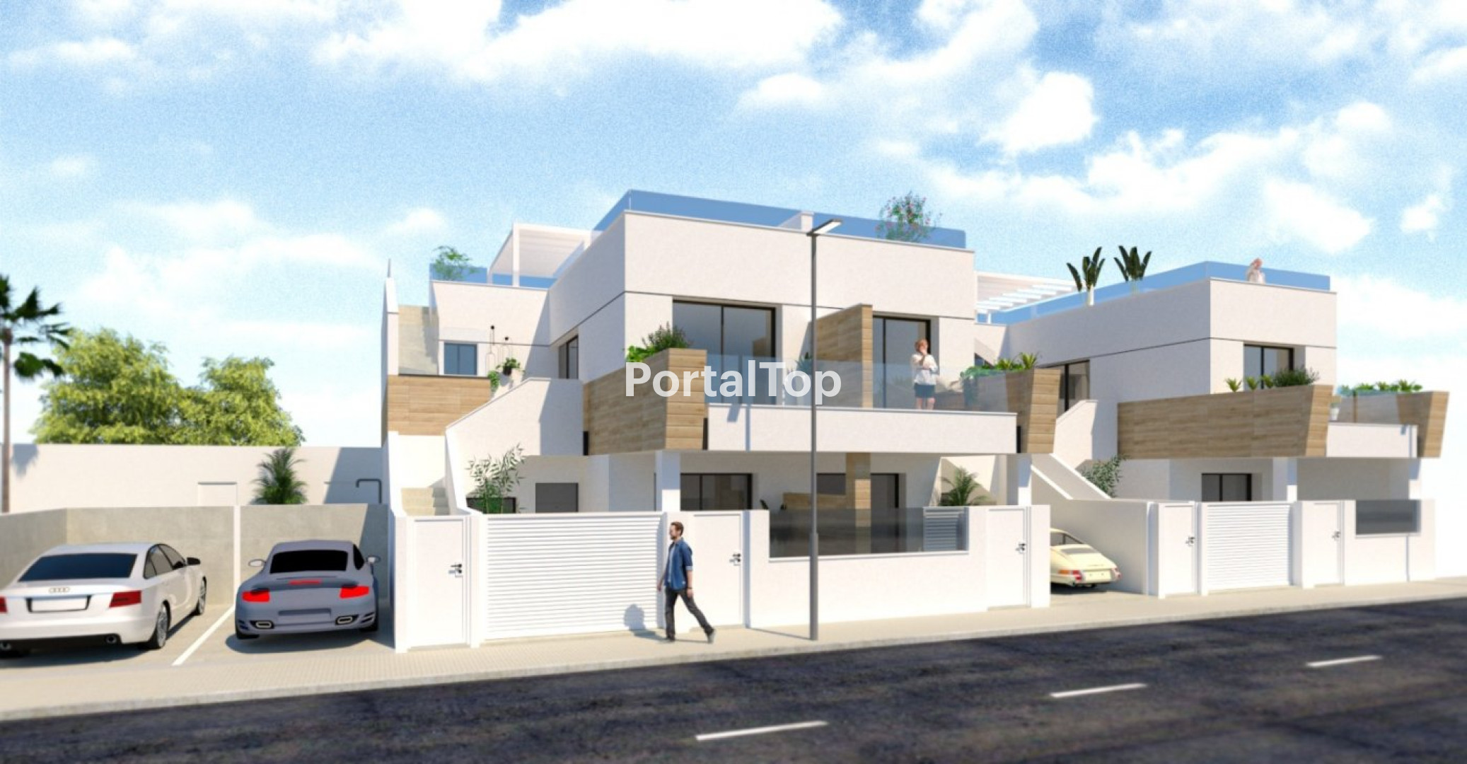 BUNGALOWS DE OBRA NUEVA EN PILAR DE LA HORADADA Proyecto de obra nueva de bungalows en Pilar de la Horadada. Este proyecto se basa en 6 bungalows de 2 dormitorios y 2 baños (uno de ellos en suite), cocina, salón, parking. Bungalows de planta baja con terraza privada y bungalows de planta alta con solarium privado, donde se encuentra la zona de barbacoa con banco y fregadero. El trastero es una opción con coste adicional. Hay una zona comunitaria para uso de los propietarios con piscina y ducha exterior. Las viviendas se entregarán con las cocinas totalmente amuebladas, con muebles en la parte inferior y superior, con el frigorífico, el horno, la placa de inducción, el extractor y la lavadora o lavavajillas, todas ellas con preinstalación de A/A por conductos, baños totalmente terminados con muebles, mampara y espejo, además de calefacción en los suelos de las mismas por sistema eléctrico, así mismo se incluyen todas las luces (Spot light), tanto en el interior como en el exterior. Conjunto residencial situado a escasos metros de todos los servicios y del centro. Pilar de la Horadada es un típico pueblo español en la parte más meridional de la Costa Blanca. La gran calle principal tiene supermercados, muchas tiendas, restaurantes y bares y algunas plazas encantadoras. Las hermosas playas de Torre de la Horadada y Mil Palmeras con arena fina y paseo marítimo está a sólo 5 minutos. En Pilar de la Horadada también hay una red de senderos para ciclistas y caminantes bien desarrollada, y también hay una gran oferta de diversas actividades deportivas. El campo de golf de Lo Romero, de 18 hoyos, está a poca distancia del pueblo. Los aeropuertos de Corvera (Murcia) y Alicante están a 40 y 55 minutos respectivamente.