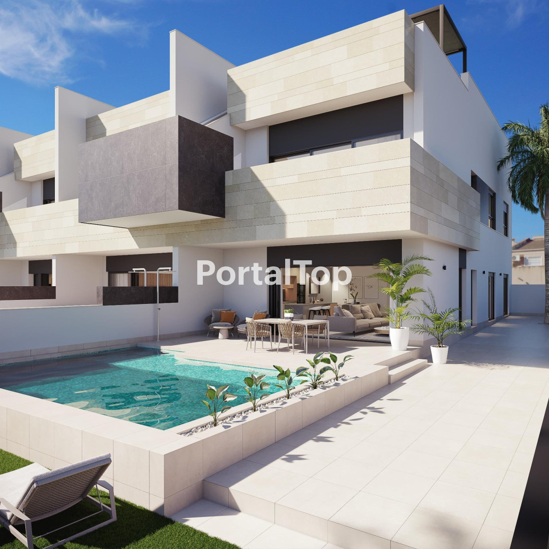 RESIDENCIAL DE OBRA NUEVA DE BUNGALOWS EN PILAR DE LA HORADADA Residencial exclusivo de obra nueva de modernos bungalow apartamentos en Pilar de la Horadada. Las unidades de planta baja tienen terrazas delanteras y traseras con jardín privado, piscina y plaza de aparcamiento. Las viviendas de planta alta tienen un gran solarium en la azotea con piscina infinita, aseo, cocina exterior, césped artificial y una pérgola, todo incluido en el precio del apartamento. Todos los bungalows tienen 3 dormitorios, 2 baños, uno de los cuales pertenece al dormitorio principal, amplia cocina americana / salón con una cocina totalmente equipada con todos los electrodomésticos y un enfriador de vino de la marca Bosch / Siemens, también un purificador de agua en la cocina. En el dormitorio principal tiene grandes armarios con puertas de cristal e iluminación interior. Los baños vienen completamente amueblados y con suelo radiante. . En el salón tiene grandes ventanas correderas hacia la terraza que se pueden empujar completamente en la pared, creando un espacio increíble en el apartamento. Todo el apartamento tiene aire acondicionado y persianas eléctricas en todas las ventanas. Todos los materiales son de la más alta calidad y el proyecto tiene un diseño único y exclusivo. Todas las viviendas disponen de plaza de aparcamiento privada. Pilar de la Horadada es un típico pueblo español en la parte más meridional de la Costa Blanca. La gran calle principal tiene supermercados, muchas tiendas, restaurantes y bares y algunas plazas encantadoras. Las hermosas playas de Torre de la Horadada y Mil Palmeras con paseo marítimo de arena fina está a sólo 5 minutos. Los aeropuertos de Corvera (Murcia) y Alicante están respectivamente a 40 y 55 minutos.