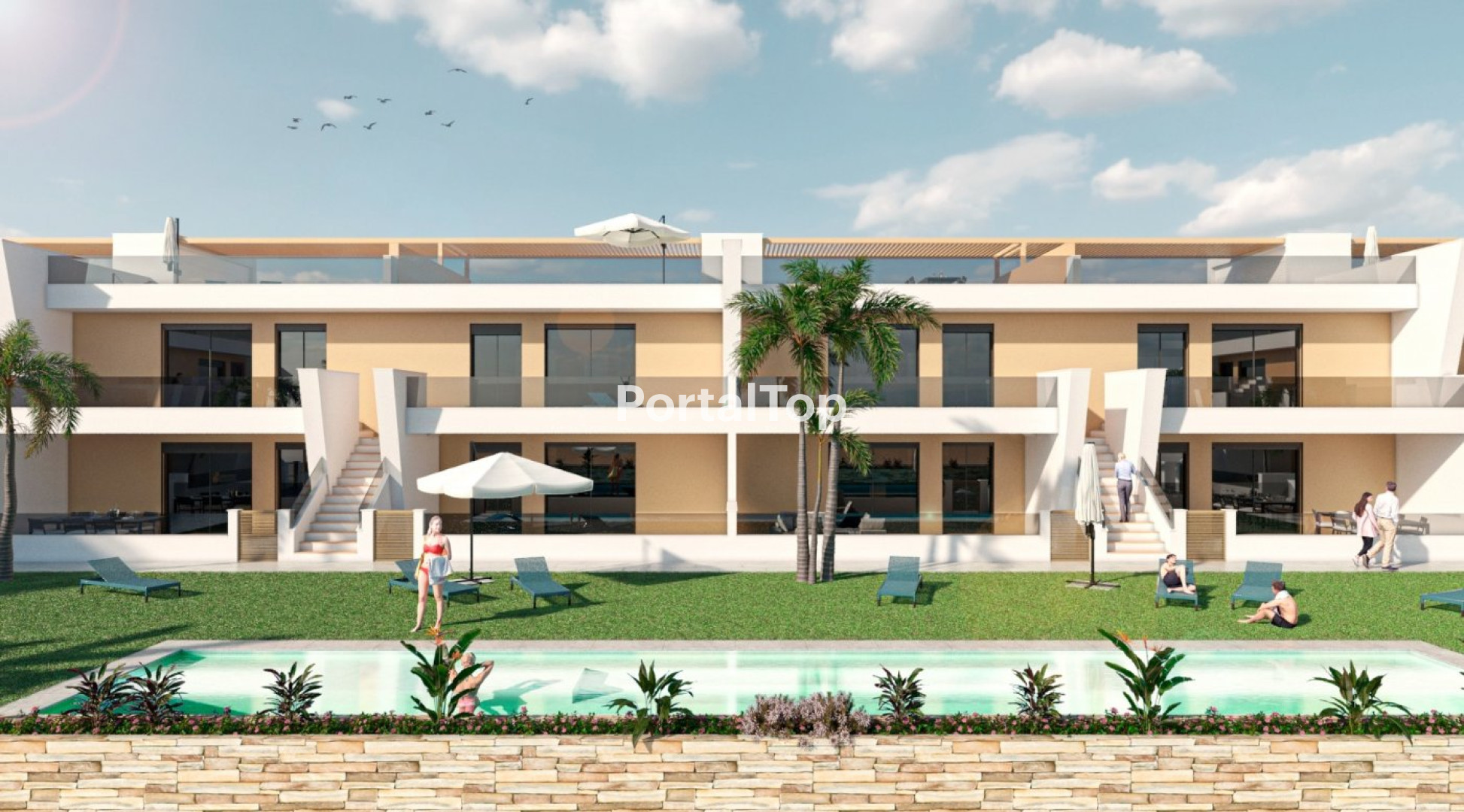 BUNGALOWS DE OBRA NUEVA EN SAN PEDRO DEL PINATAR Complejo residencial de nueva construcción de bonitos y modernos bungalows de 3 dormitorios en San Pedro del Pinatar. Los bungalows de la planta baja tienen una terraza con jardín privado. Los bungalows de la planta alta tienen un gran solarium. Todos los bungalows tienen una plaza de aparcamiento. Dispone de zona ajardinada común con piscina. La ubicación privilegiada de San Pedro del Pinatar en el Mar Menor y la costa mediterránea atrae a aquellos con un interés en la navegación y los deportes acuáticos, proporcionando amarres en el puerto deportivo y clubes de vela, mientras que las playas y los baños de barro naturales atraen a aquellos que buscan sol, mar y arena seguros. San Pedro del Pinatar cuenta con una comunidad consolidada y ofrece una excelente gama de actividades, incluyendo piscina cubierta e instalaciones deportivas, así como un programa de actividades sociales durante todo el año por el agradable clima invernal. Los beneficios de los baños de lodo, típicos de la región, o las tranquilas aguas del Mar Menor, han favorecido el crecimiento de Lo Pagán, que actualmente cuenta con todo tipo de comodidades. Además, cuenta con una excelente ubicación, a sólo 5 minutos del Centro Comercial Dos Mares. El aeropuerto de Murcia/Corvera está a 30 minutos y el de Alicante a una hora en coche.