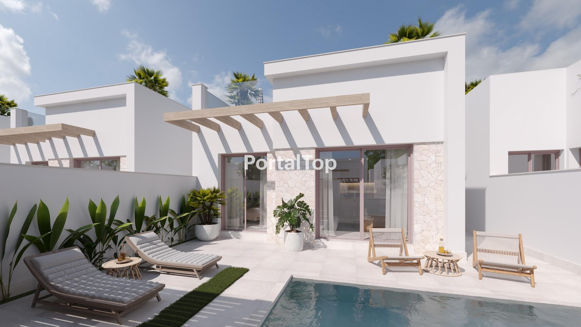 VILLAS PAREADAS DE OBRA NUEVA EN ROLDAN Villas pareadas de obra nueva en Roldan, Torre Pacheco. Villas modernas construidas en una sola planta, dispone de 2 o 3 dormitorios, 2 baños, cocina americana con el salón, armarios empotrados, solarium privado. Todas las villas tienen jardín privado con piscina y plaza de aparcamiento. Roldán en sí es un pueblo tradicional con todos los servicios locales que necesita, incluyendo supermercados, restaurantes, bares, clínica de salud, farmacia, estación de policía, gasolinera, mecánicos, dentistas, médicos y mucho más. Los cercanos campos de golf de La Torre y Terrazas son de fácil acceso, el aeropuerto de Corvera está a 15 minutos y las playas del Mar Menor a sólo 20 minutos en coche.