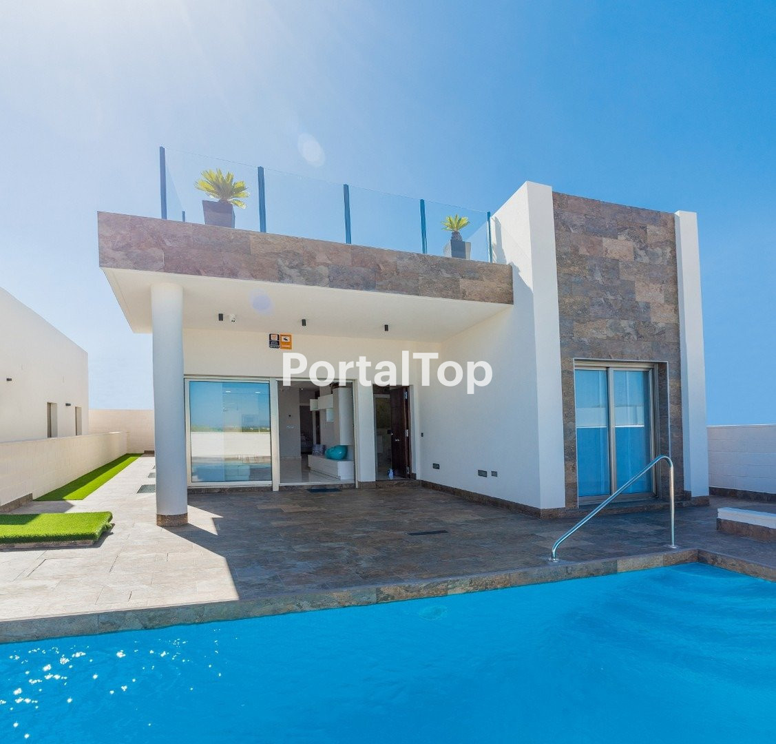 CONTEMPORARY VILLA NEXT TO THE GOLF COURSE Contemporary villa located next to the exclusive Villamartín golf course, facing Southeast. It consists of 3 double bedrooms (all with built-in wardrobes), 3 bathrooms (one en suite), fully equipped modern integrated kitchen (with breakfast bar), large open living / dining room leading to an enclosed garden with private pool and parking area, and a spacious rooftop solarium. Close to the charming beaches, coves and marinas of Cabo Roig and Campoamor, close to 3 different golf courses. Also the services of a wide variety of bars and restaurants, live entertainment and shopping centers such as La Zenia Boulevard and Los Dolces. And the benefits of good road connections and Alicante Airports and Murcia International Airports.