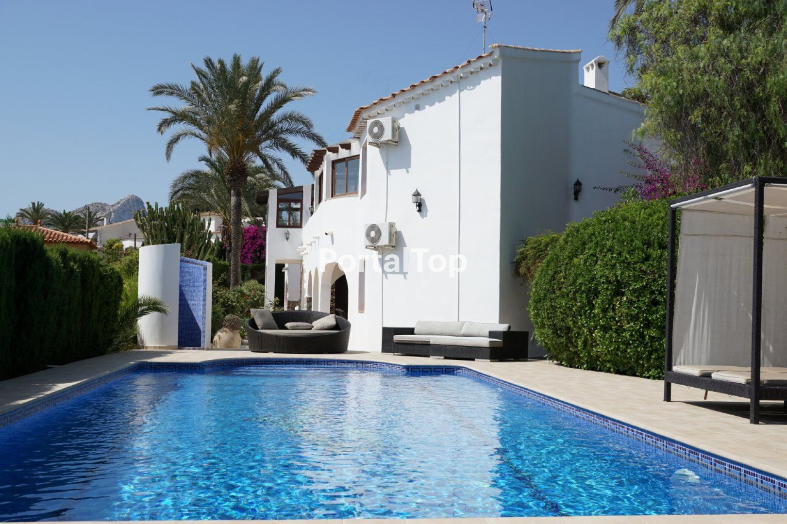A perfect Mediterranean home in a privileged location 150 meters from the sea and a short walk along one of the Mediterranean's most beautiful cliff top paths to Basetes harbour. This exceptional property occupies three separate plots ( total 1.665m2 ) to provide ample space for the large house (639m2) and an extensive and private tropical garden with a 10x5m swimming pool (prepared for a heat pump). The house is a attractive combination of modern comfort with traditional features and was entirely renovated in 2016 to include a large and fully equipped gymnasium with it's own rest lounge and sauna. In total, the property provides 7 bedrooms (2 in a separate guest apartment, and one studio), eight bathrooms, three kitchens (one of which has a cooking island is incorporated into a part open/part enclosed entertainment terrace with lovely sea views) and two living rooms (one in Ibizan style with a wood burning chimney with surrounding sunken seating and a nice stained glass window. This very private villa has a large automatic street gate, paved exterior parking and a closed garage, plus a workshop, store rooms and a laundry room. Automatic irrigation system, old mature cypress hedges, fruit trees with everything kept in perfect condition. A exceptional permanent home on the Mediterranean coast. House 639m2, plot 1665m2.[IW]