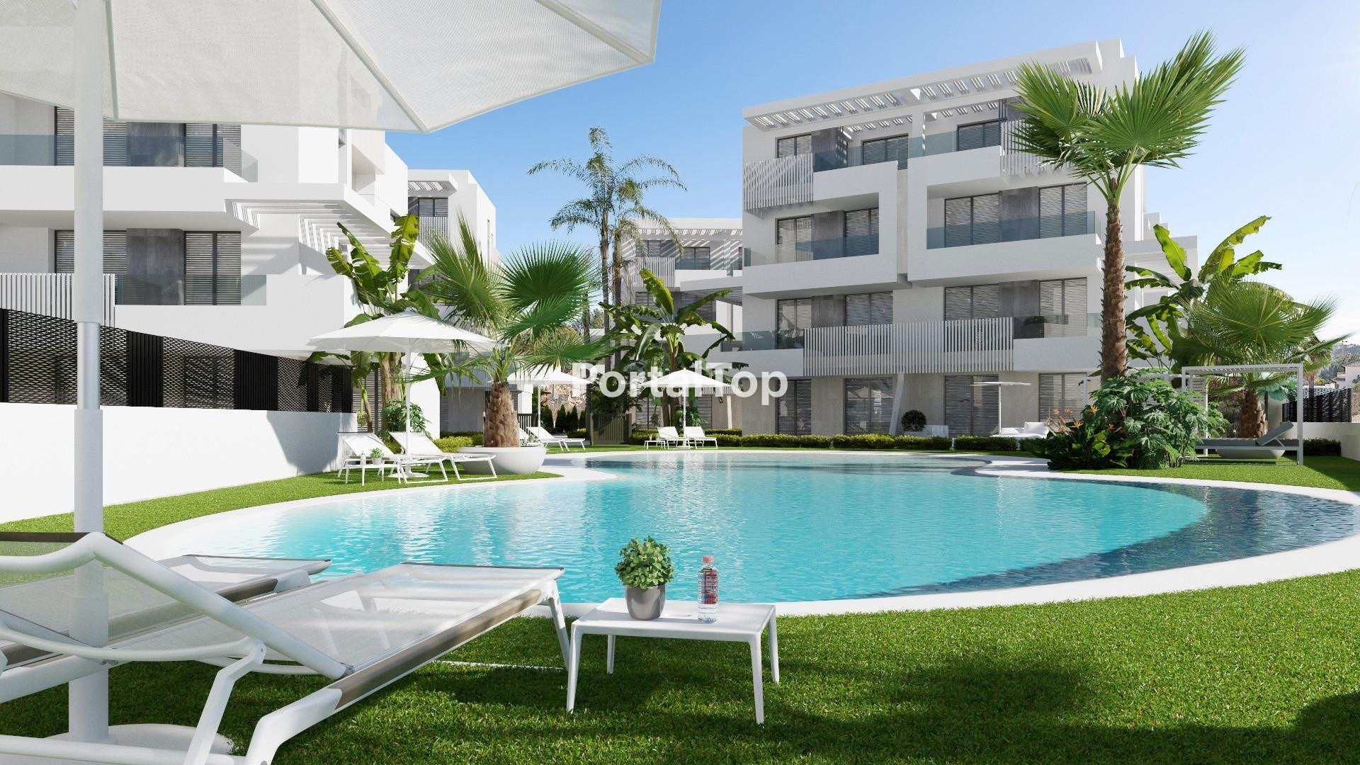 NEW BUILD APARTMENTS IN PRIVATE GATED RESORT IN PROVINCE OF MURCIA New Build residential complex of 6 blocks, a total of 42 apartments. Beautiful apartments have 3 and 2 bedrooms and 2 bathrooms with views of the large lake and green areas of this large luxury resort. Ground floor apartments with private garden, top floor apartments with private solarium. Complex has a communal pool and all the apartments have a parking pace and a storage room. Located in a private gated resort, with a main access entrance and 24 hours security. The resort is designed around an impressive 126.000 m2 green area. It comprises walking and cycling paths, sport facilities, paddle and tennis courts, a mini-golf course, gardens, dog parks, leisure areas, clubhouse…. Also in the central area is the jewel of the resort, a crystal-clear artificial lake of almost 17.000m2 of water surface, surrounded by white sandy beaches and palm trees, bringing a piece of the Caribbean to the Murcia Region. There are 2 islands in the lake, one of them has its own bar, there are also “beach Chiringuitos” spread around the lake. The resort is strategically located less than 4 km from the beach and the town of Los Alcázares, where you can practice various water sports, surrounded by several golf courses and the city of Cartagena less than 15 minutes by car and 22 km from Murcia airport, therefore having a wide cultural, gastronomic and sports offer within reach.